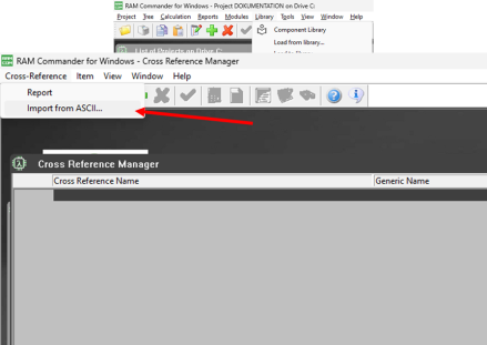Um die Querverweisliste einzubinden, gehen Sie in RAM Commander, wenn die Project Ansicht im Vordergrund ist, auf das Menü Band und wählen aus Library < Cross Reference aus.